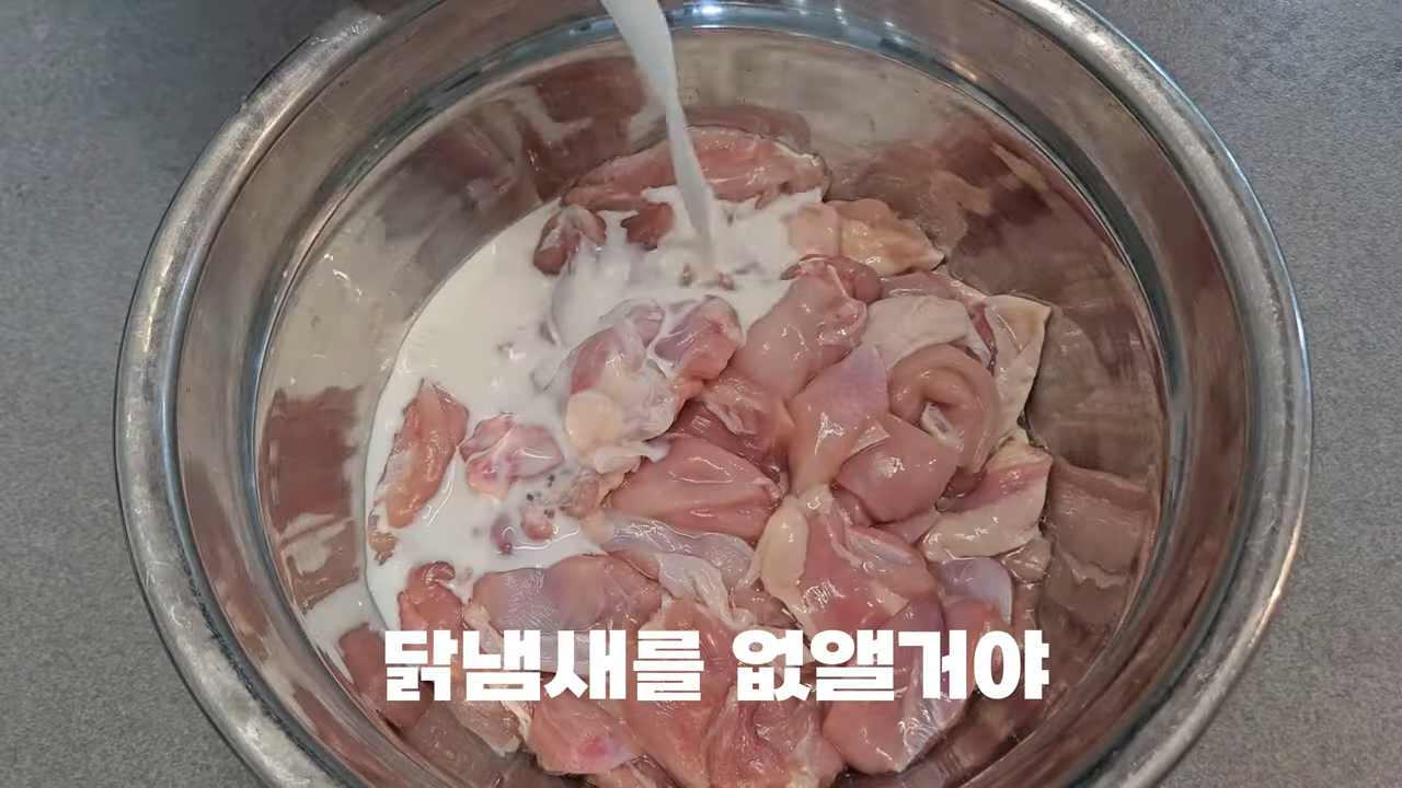 1시간 후, 닭다리살을 흐르는 물에 깨끗이 씻어줌으로써 우유와 함께 제거된 잡내를 완전히 없애줍니다.